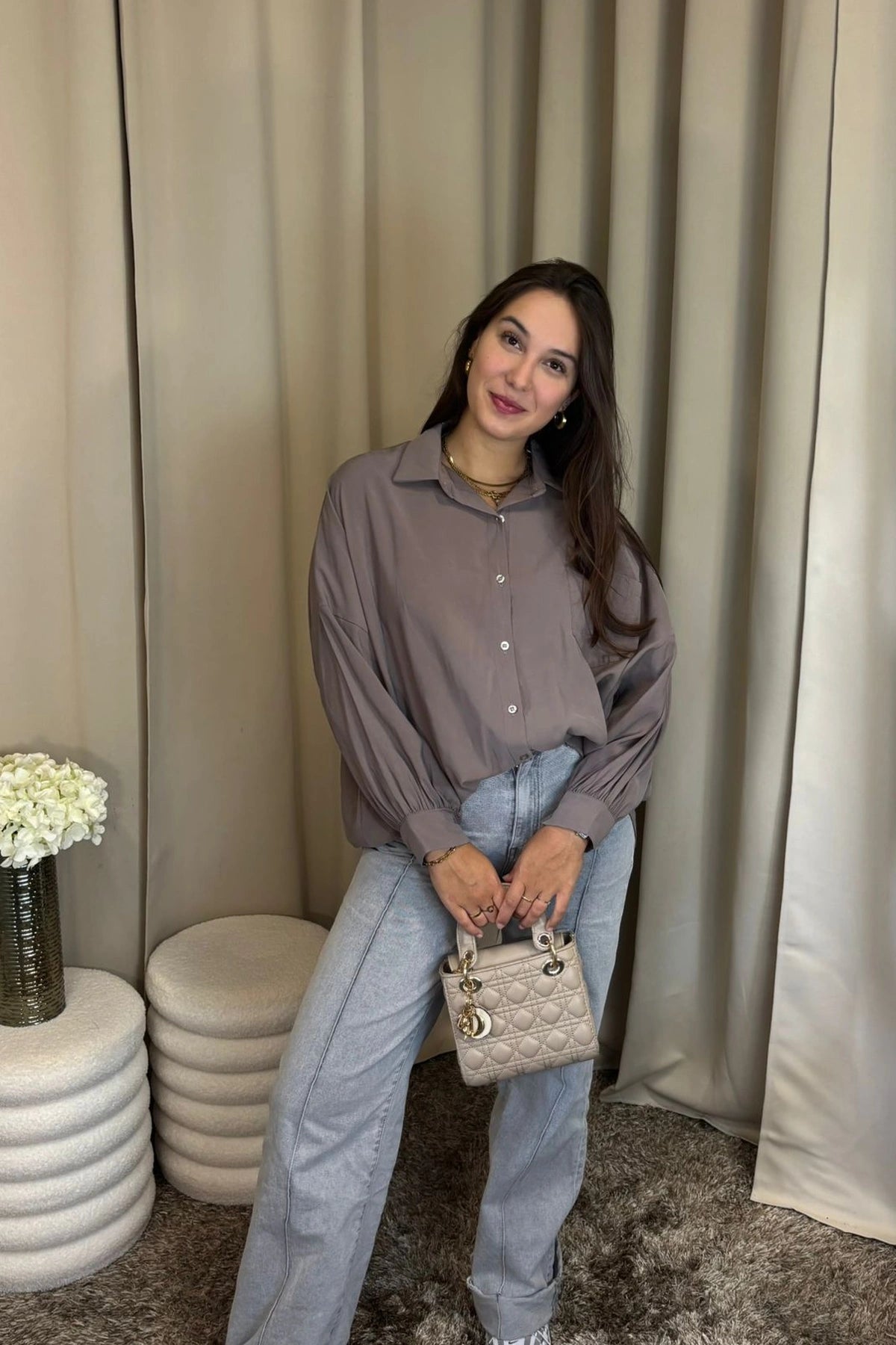 Gedetailleerd met een kraagje, knoopjes en lange mouwen.